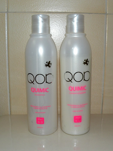 Ganhei da Luiza um kit Qod Quimic, com Shampoo e Condicionador. Os produtos dessa linha funcionam como um “memorizador” de alisamentos e permanentes e foram bolados para quem fez chapinha de chocolate, japonesa, egípcia e “cousas” do tipo.