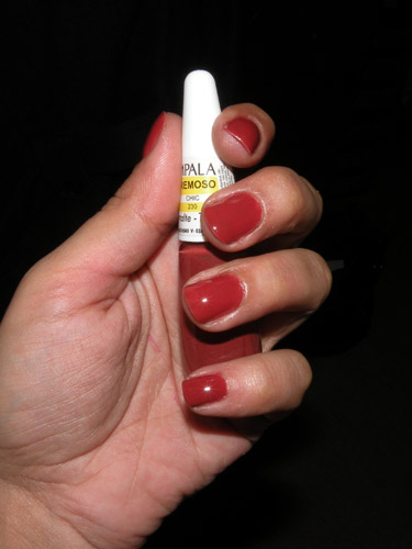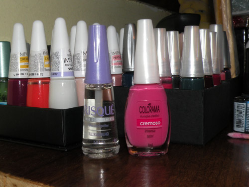 Consegui fazer a unha com o esmalte Sexy da Colorama (duas camadas), mais o Ultra Brilho da Risqué (uma camada).