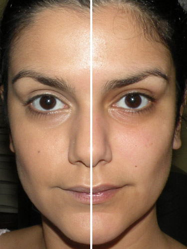 Eu a apliquei com pincel no rosto, mas usei os dedos para disfarçar as olheiras.