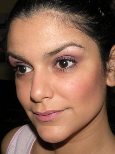 Apliquei um pouco da mesma cor na linha dos cílios inferiores e fiz a margem da sobrancelha misturando as sombras Rose e Mauva.