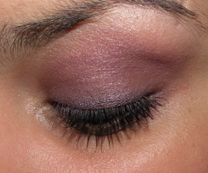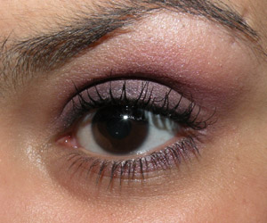 Delineeei a margem dos cílios com o lápis, passei a sombra Ameixa em toda a pálpebra móvel e esfumei um pouco da cor Púrpura no côncavo.