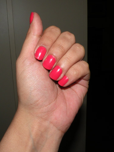 O esmalte é um coral cremoso leeeeeeeeeeendo. A Jô passou duas camadas dele e uma demão de um óleo secante da Revlon e o bichinho está digno até hoje. Amey!