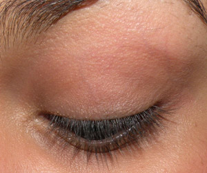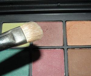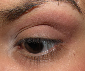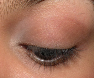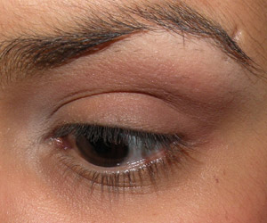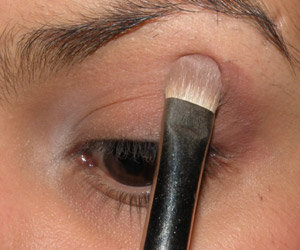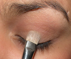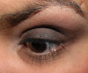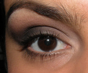 Ainda com o mesmo pincel, passei sombra marrom no canto externo da pálpebra móvel e em todo o côncavo, puxando um pouco para cima no canto externo.