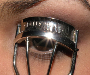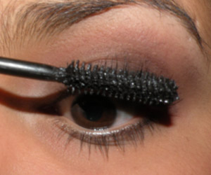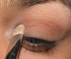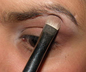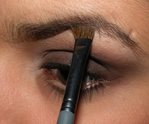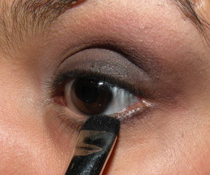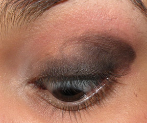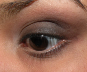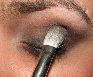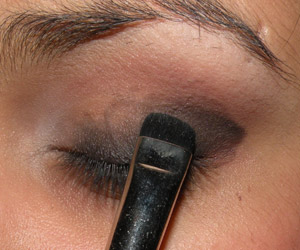 Com um pincel pequeno (MAC 214), borrei sombra preta no canto externo da pálpebra e do côncavo e na linha dos cílios superiores.