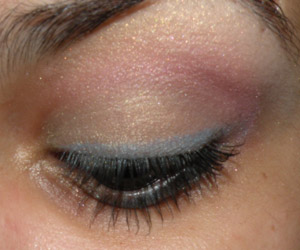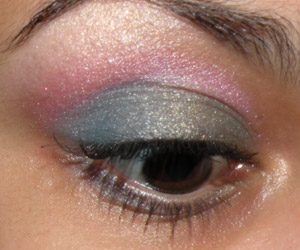 Passei a sombra verde no canto interno e centro da pálpebra, azul no canto externo, rosa no côncavo e branco na margem da sobrancelha.