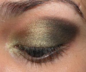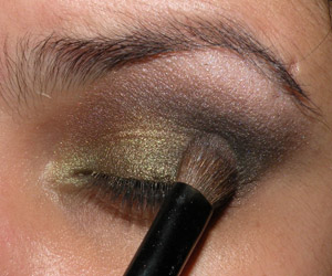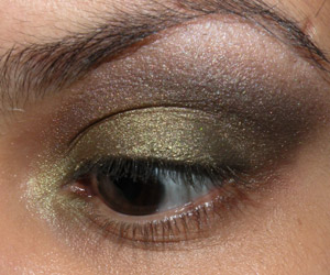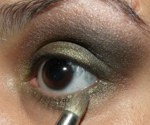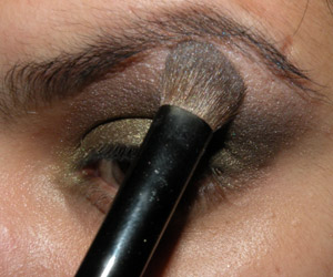 Ainda com o SS239, apliquei a sombra suspicion (MAC) no canto externo do olho e esfumei em direção à sombra oliva.