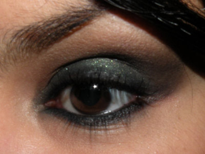 O que eu fiz foi aplicar a sombra verde só na parte da pálpebra móvel que aparece quando ela está de olho aberto e marrom na parte de cima da pálpebra e no côncavo, esfumando para cima e em direção à sobrancelha.
