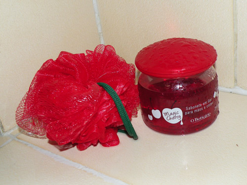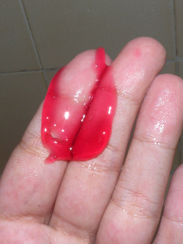 O gel vermelhinho parece uma gelatina e é até difícil de passar na esponja, porque ele não “espalha” muito bem, entende? Mas ele tem um cheiro incrível de cereja que me traz belas lembranças da infância, porque lembra a Gelatina Royal e o Bocão.