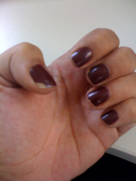 Parecia uma ótima idéia no vidrinho, mas achei meio sem graça nas unhas. O esmalte é um marrom com fundinho avermelhado e o acabamento tem uma leve (bem leve mesmo, quase imperceptível) cintilância.