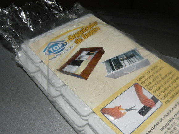 Como vocês podem ver, o organizador é composto por tiras de plástico que se encaixam. Todas as tiras são do mesmo tamanho e você pode cortar uns pedacinhos aqui ou ali para que elas se adaptem à largura e profundidade da sua gaveta.