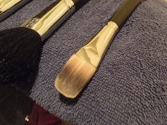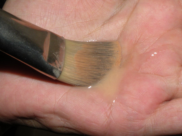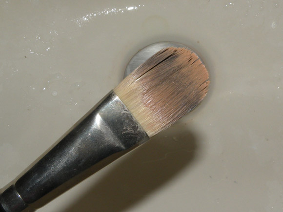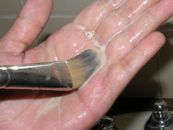 Com pincel de base não tem muita graça, porque não faz tanta espuma, mas a idéia geral é esfregar até notar que a sujeira descolou das cerdas e passou pra espuma.