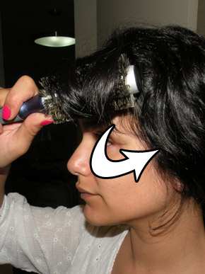 Com a escova menor eu enrolo a franja e puxo pro lado enquanto passo o secador, tipo a super ilustração com seta ali em cima.