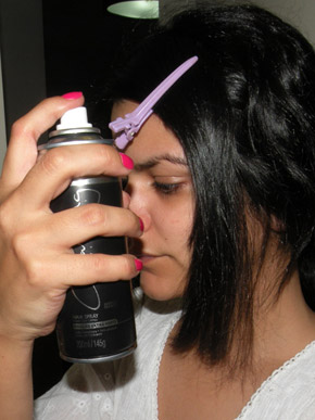 Com a parte frontal bem lisinha e caída pro lado, eu prendo a franja com um clips que não marca o cabelo e dou algumas baforadas de spray de fixação.