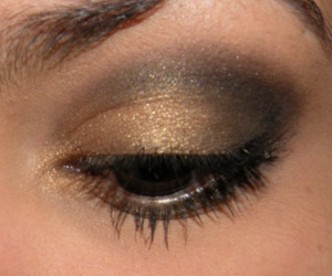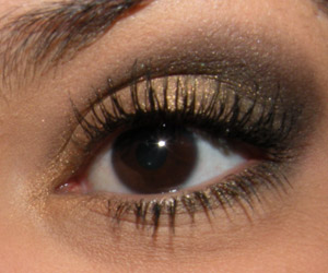 Passei a sombra Dourada Acobreada na pálpebra móvel e canto interno do olho e escureci o côncavo e canto externo com a Grafite.