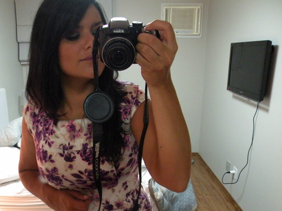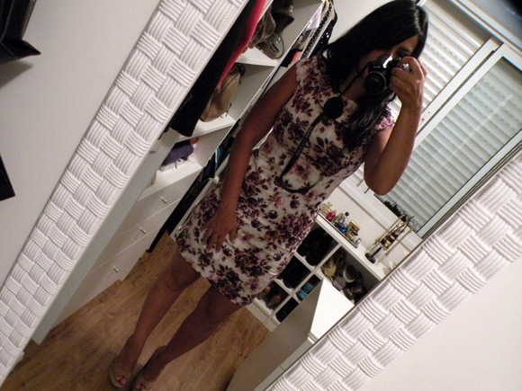 Para combinar com o olho super colorido, escolhi um vestido de estampa floral em tons de roxo e lilás.
