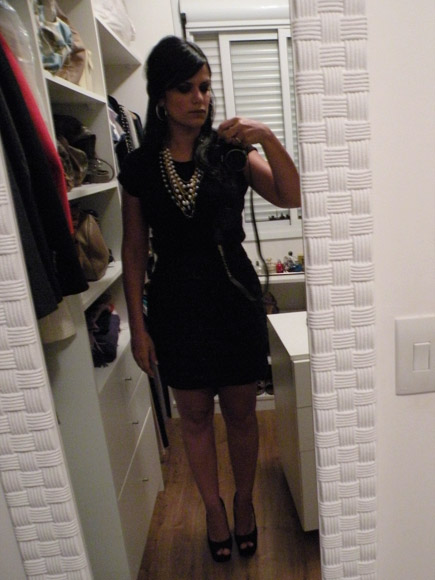 E esse é o modelito: Saia preta, blusa preta meio podrinha, colar de pérolas e saltão também preto.