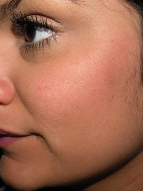 Esfumar pequena quantidade do blush nas maçãs do rosto com a ponta dos dedos, passando das bochechas até as têmporas. Para construir intensidade de cor, aplique mais blush.