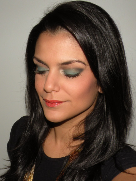 Escolhi o make da Juliana Jabour, que tem sombra verde e batom laranja.