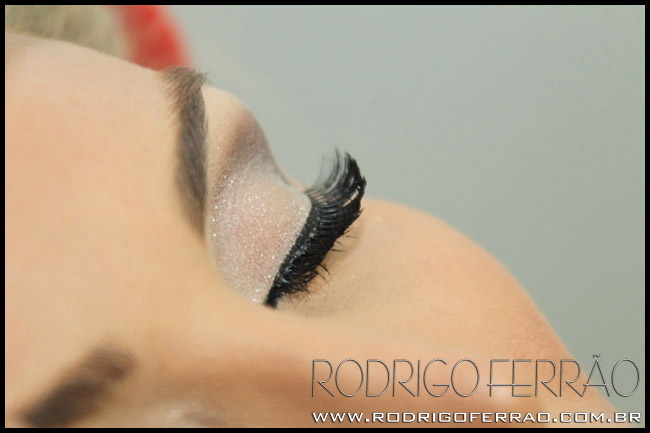 O make dos olhos é estilo clássico de noiva. Ele tem a pálpebra móvel bem iluminada, côncavo marcado, delineador preto e muitos postiços.