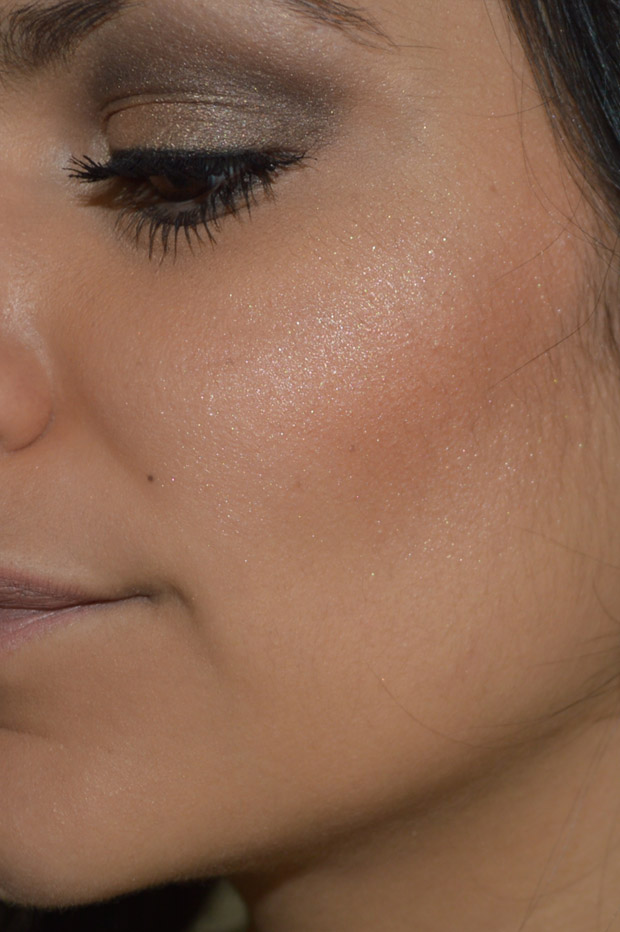 Não parece tanto nas amostrinhas do braço, mas no rosto se nota bem as partículas de brilho.
