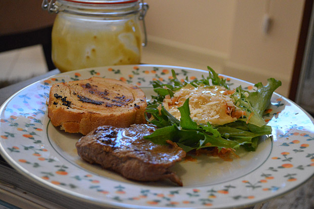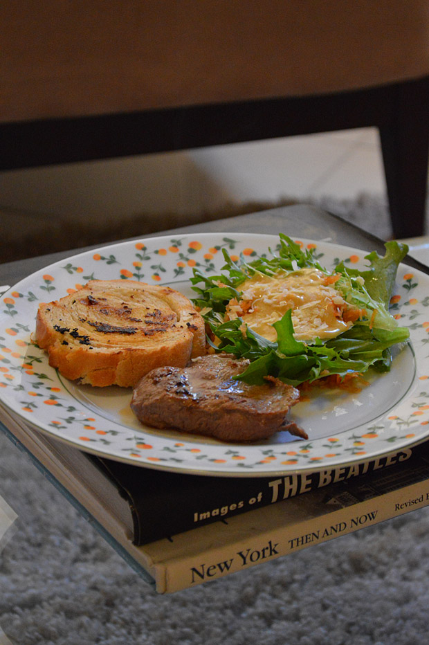 No dia que fiz as fotos, o almoço era salada de alface baby e cenoura ralada com molho de mostarda e mel, filé magro grelhado e uma fatia de pão italiano tostado na grelha com um pouco de manteiga light.
