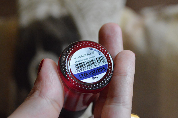 Foi usada base da Risqué, duas camadas do Dark Rose e uma cobertura de brilho que não identifiquei a marca quando a manicure passou.