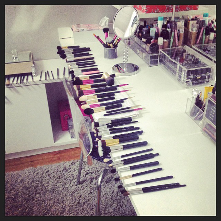 Depois de sete anos de blog, a minha coleção de pincéis é bem grande e por um lado é muito legal, porque não preciso me preocupar com a limpeza semanal dos pincéis, já que se um pincel está sujo, tenho outros parecidos para substituir.
