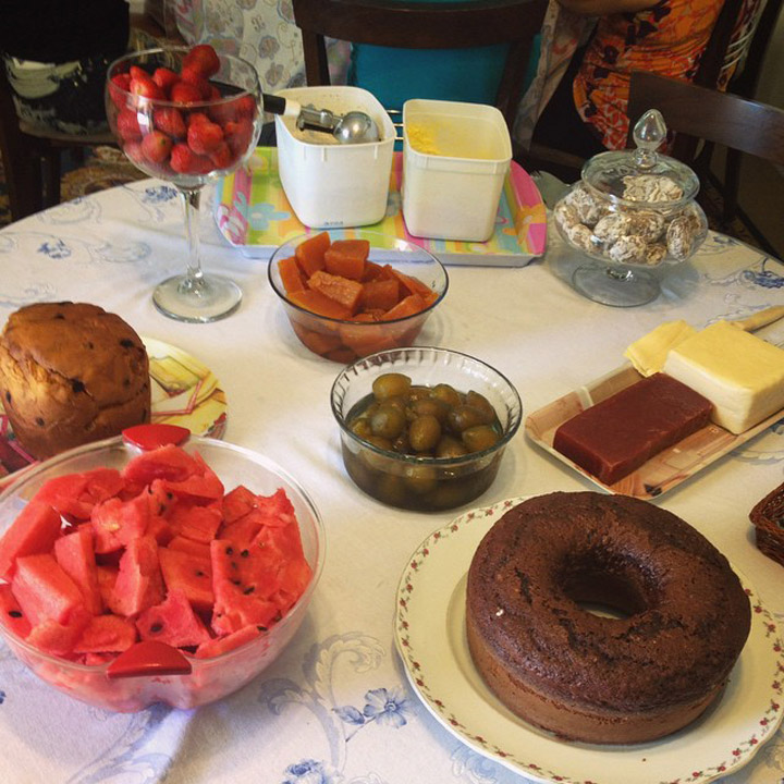 A mesa de sobremesas também tinha melancia, morangos, panetone, Romeu e Julieta, sorvete e pão de mel.