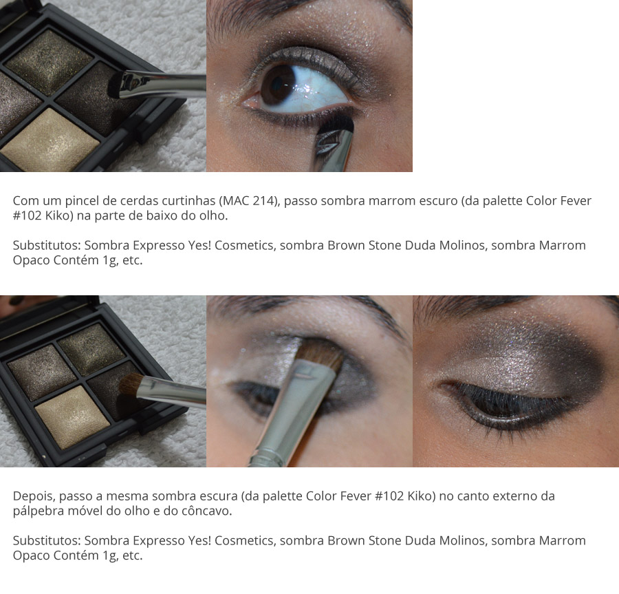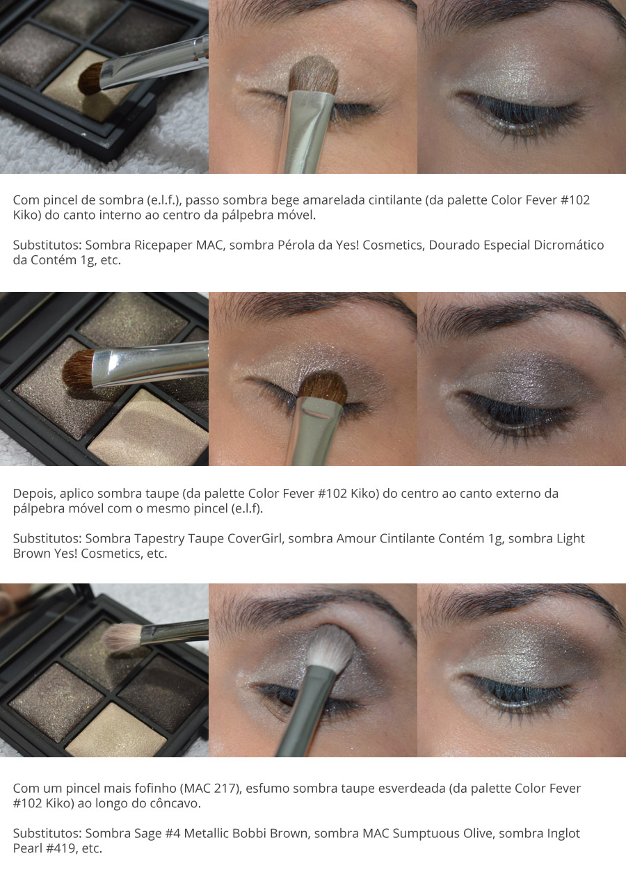 Hoje eu aproveitei o tutorial para experimentar as sombras da palette Color Fever #102 da Kiko que trouxe de viagem há um tempão. As cores do estojo são neutras e puxam pro taupe (um marrom mais acinzentado). Além do brilho lindo, elas tem pigmentação beeeeem legal!