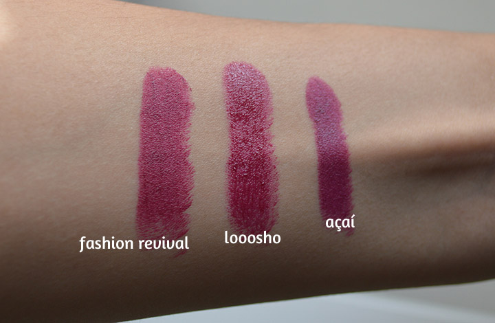 Os acabamentos também são diferentes, já que o Açaí é um matte bem cremoso, o Fashion Revival é totalmente fosco e o Looosho é mais lustroso.