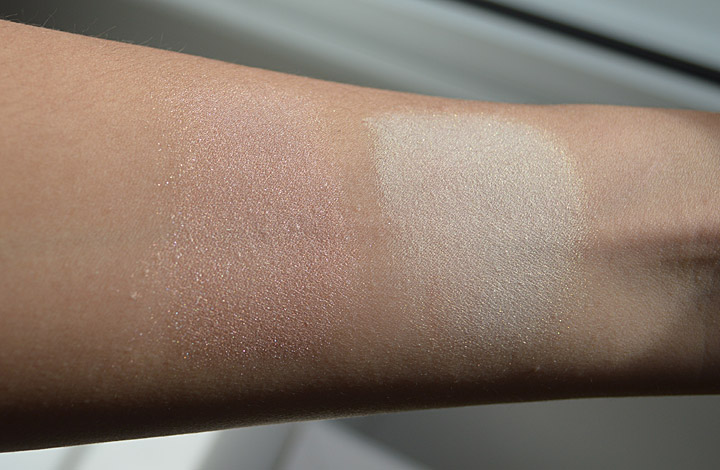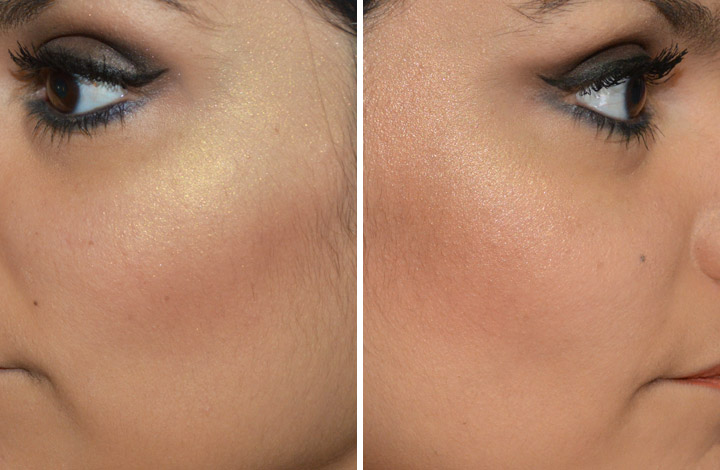Ambos aderem bem à pele e a intensidade do brilho varia dependendo do quanto você aplicar de pó.