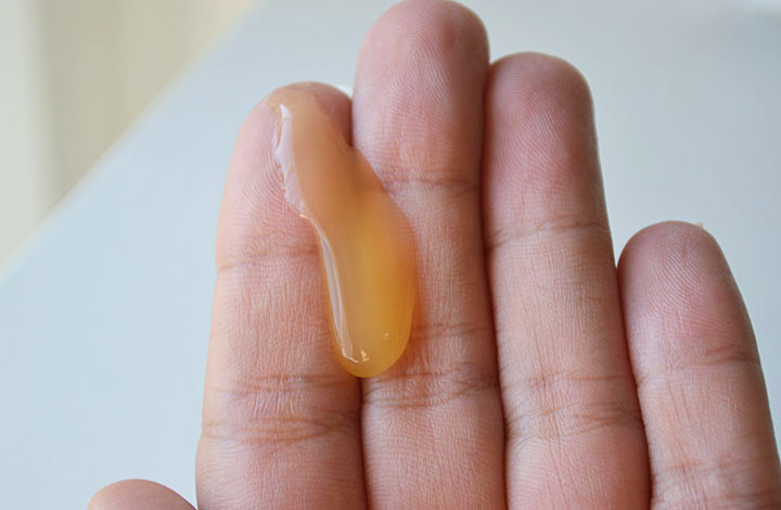 A textura do gel é encorpada, parece uma geléia de manga por conta da cor amarelinha, e o efeito refrescante é levinho.