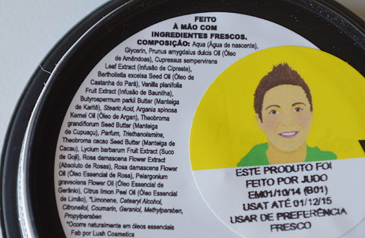 Recebi esta amostra da assessoria da Lush e quando acabar, não devo comprar um pote grande, porque mesmo deixando meu banho mais agradável e cheiroso, o custo de mais de R$100 não compensa, afinal, eu ainda tenho que usar hidratantes no corpo.