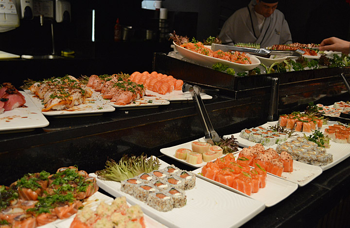 Por conta disso, acabo repetindo várias vezes as entradinhas e só passo no buffet para comer o atum com crosta de gergelim que é MUITO gostoso e para pegar alguns (vários) espetinhos do especial do chef, um enrolado de salmão e haddock flambado, recheado com shimeji e cream cheese e coberto por molho agridoce.