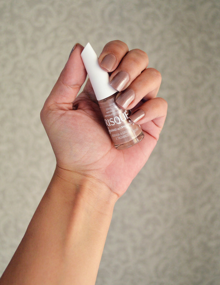 O esmalte que usei foi esse nude da coleção Diário de Viagem da Risqué, o Agrada a Gregos e Troianos.