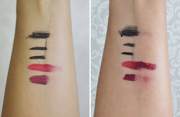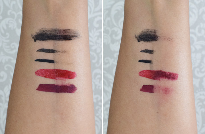 Como vocês podem notar pelas fotos, os dois tipos de delineador saíram fácil. O rímel à prova d’água só saiu quando esfreguei com mais de força. Já os batons escuros, mesmo esfregando bastante, deixaram resíduos.