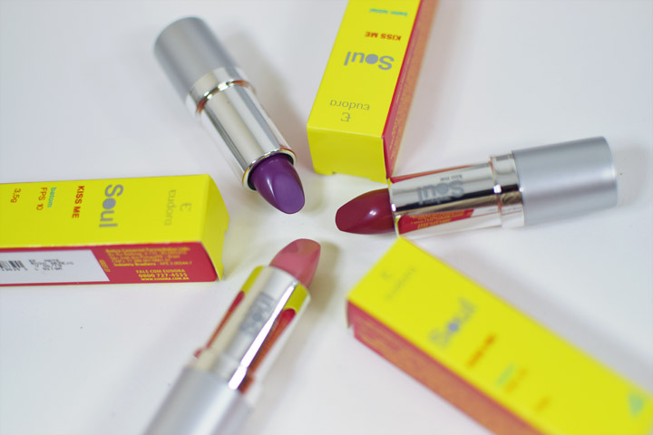 Os batons são da linha Soul Kiss Me, a mais acessível de Eudora, e tem fórmula de Efeito Matte com textura sequinha e acabamento opaco.