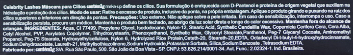 Celebrity Lashes Máscara para Cílios Contém 1g Make-Up define os cílios. Sua formulação é enriquecida com D-Pantenol e proteína de origem vegetal que auxiliam na hidratação e proteção dos cílios.