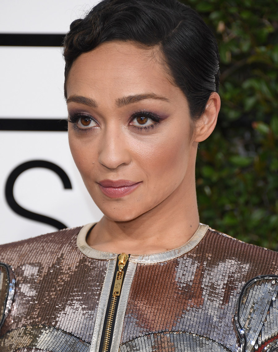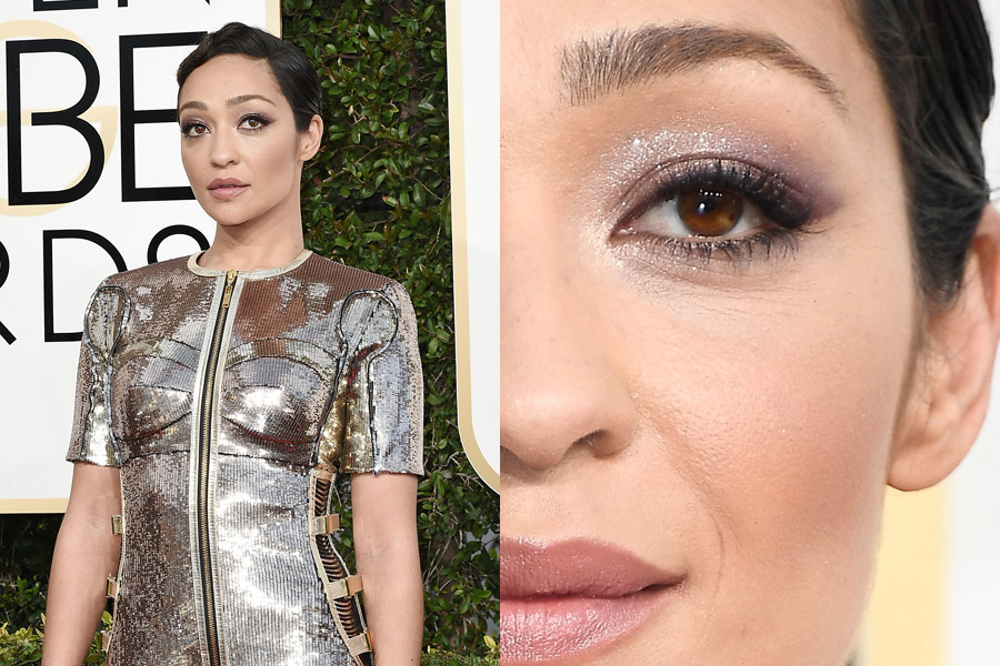 Ruth Negga estava linda com um vestido metálico da Louis Vuitton no Globo de Ouro desse ano, mas o modelito não foi o único a brilhar no tapete vermelho, porque a maquiagem com sombra berinjela e muita cintilância também era incrível.