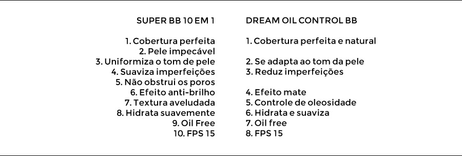 A diferença maior é que o Dream Oil Control foi desenvolvido especialmente para maquiar e cuidar da pele oleosa. O Super BB Cream 10 em 1 também tem efeito anti-brilho, mas foi feito para todos os tipos de pele.