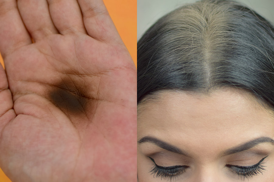 Na palma da mão, esse shampoo seco é marrom de fundo quente. No meu cabelo, o resíduo fica bem mais claro/bege.